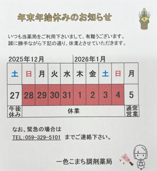ーーお知らせーー2025.12.1 年末年始休みのお知らせです。2025.9.4 「薬剤師認知症対応力向上研修」を修了しました。(薬剤師)2025.9.4 「ヒューマンエラー」研修を実施しました。2025.8.6 「感染症対策」研修を実施しました。
